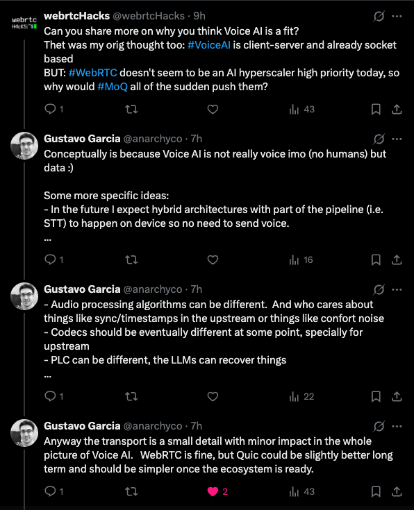 To summarize his argument – WebRTC is really good at transmitting human voice, but doing that is intrinsically hard, so the solution is complex. LLMs don’t need all the extra processing that humans require and don’t need such a complex solution, so MoQ could be a better fit here.